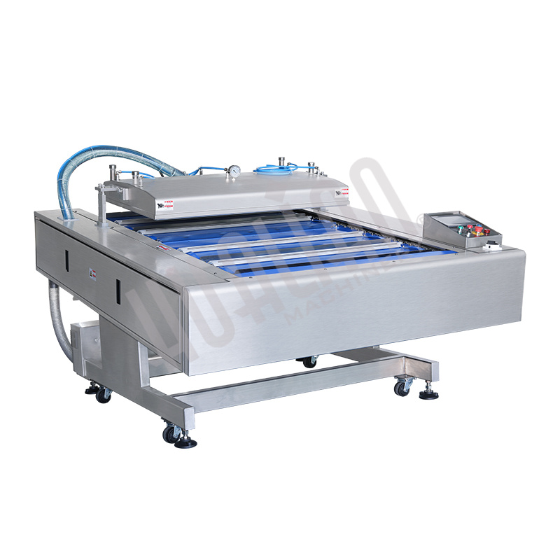 Материал изготовления – полностью нержавеющая сталь. Вместительная рабочая камера позволяет умещать за один раз большое количество пакетов. В камере установлены 2 запаечные планки длиной по 1020 мм (либо может быть установлена 1 планка, все зависит от размера пакета). Функционирование аппарата схоже с двухкамерным упаковщиком, что обеспечивает высокую скорость упаковки. Регулируемый угол наклона упаковочного стола упрощает работу с жидкими и сыпучими продуктами.